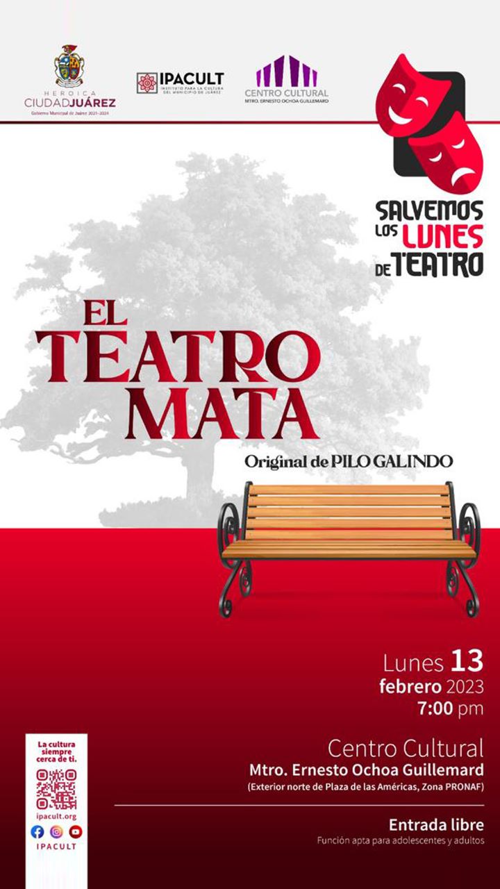 Las actividades artísticas continúan también los lunes, por lo que, el Instituto para la Cultura del Municipio de Juárez (IPACULT), invita este 13 de febrero a las 7:00 de la tarde, a iniciar la semana con la presentación de la obra El Teatro Mata, original de Pilo Galindo, dentro del programa de reciente creación “Salvemos los lunes de teatro’.