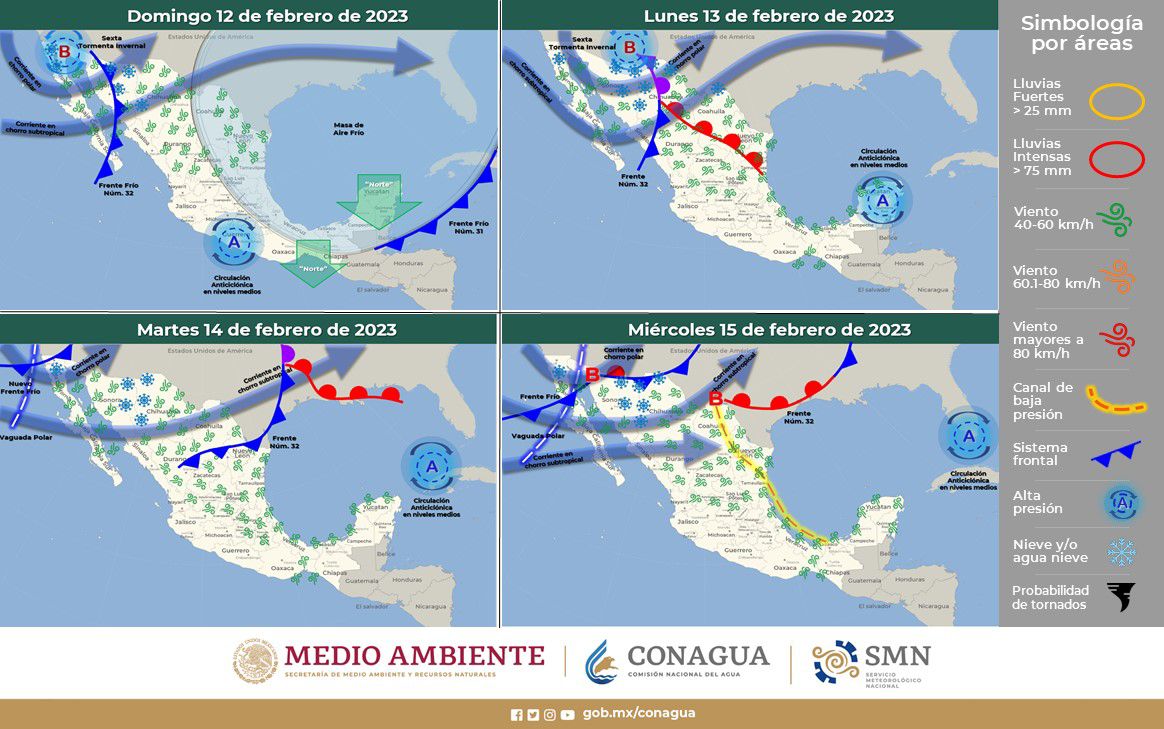 La Coordinación Estatal de Protección Civil (CEPC) que a partir de la tarde de este sábado 11 de febrero, se presente caída de aguanieve, nieve y lluvia en el territorio estatal debido al paso de la Sexta Tormenta Invernal y del Frente Frío Número 32 por la entidad.