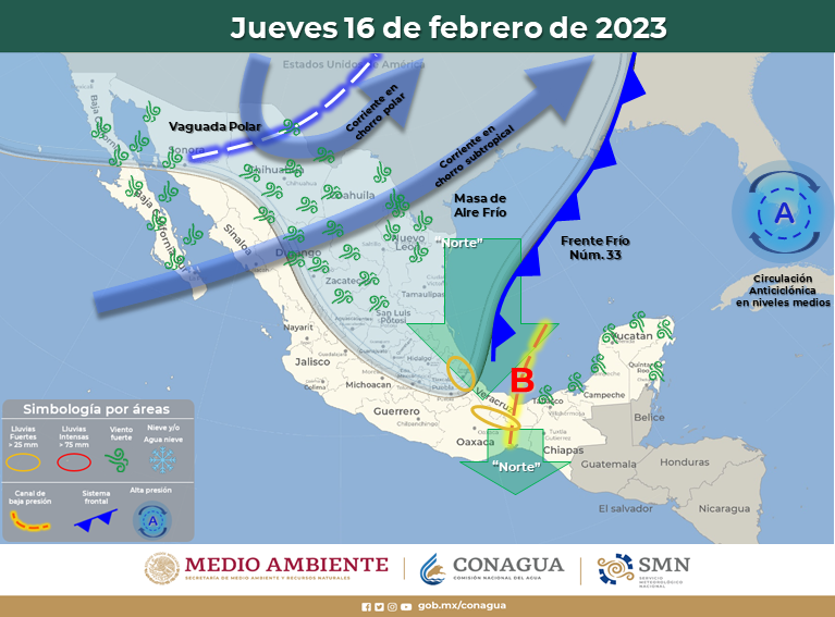 Para este jueves, la masa de aire polar que impulsa al frente frío número 33 en interacción con una vaguada polar y la corriente en chorro, favorecerán ambiente muy frío con heladas por la mañana, de frío a templado por la tarde, temperaturas de gélidas a muy frías en la zona serrana, cielo de despejado a parcialmente nublado, vientos de 10 a 25 km/h, pueden superar los 55 km/h en parte de la zona oeste, incluye: Carichí; pueden superar los 45 km/h en partes de las zonas oeste, suroeste y sureste, incluye: Guerrero, Bocoyna, Guachochi, Balleza, Cuauhtémoc, Riva Palacio y Jiménez.