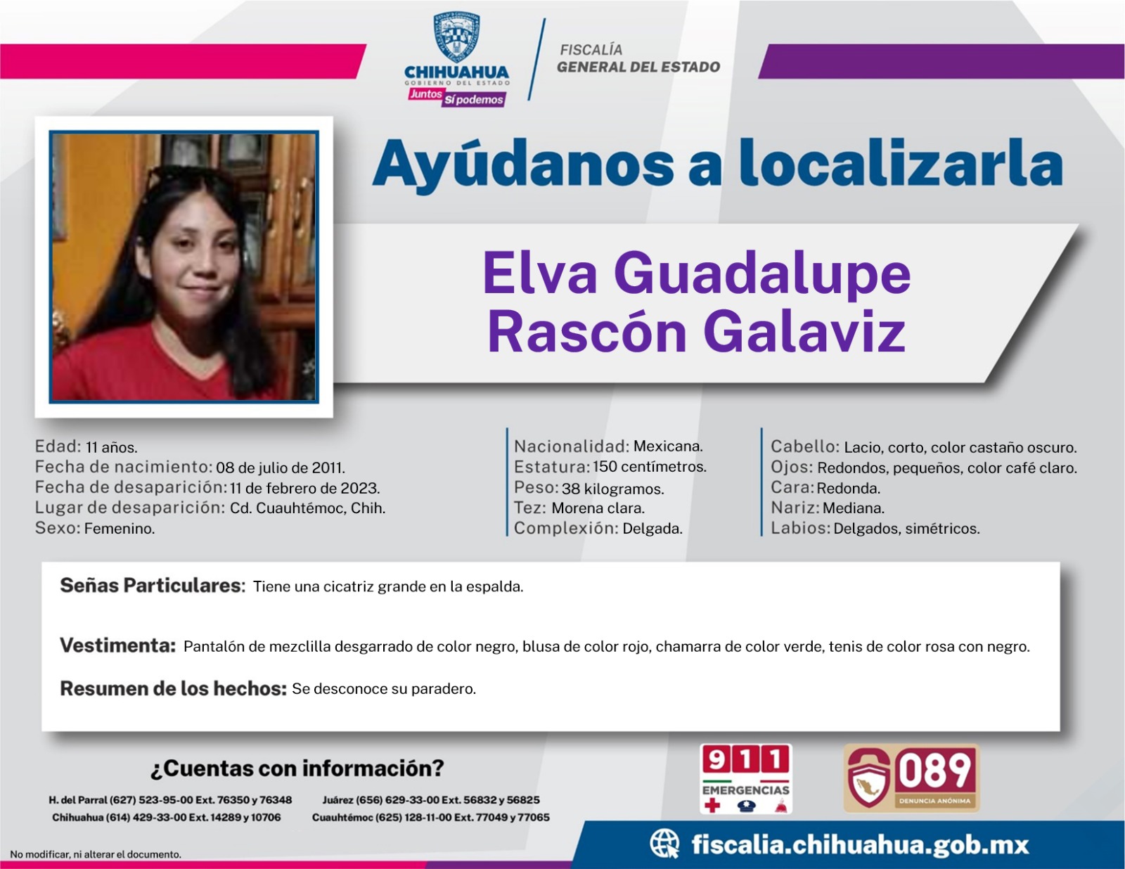 Para lo cual, se solicita a la ciudadanía que conozca información útil para localizarla, llamar al número de Emergencias 911 y proporcionarla, o bien, en los teléfonos de la Fiscalía de la Mujer en Cuauhtémoc o en la Comisión de Búsqueda, al teléfono 614-42933-00 extensión 11343.