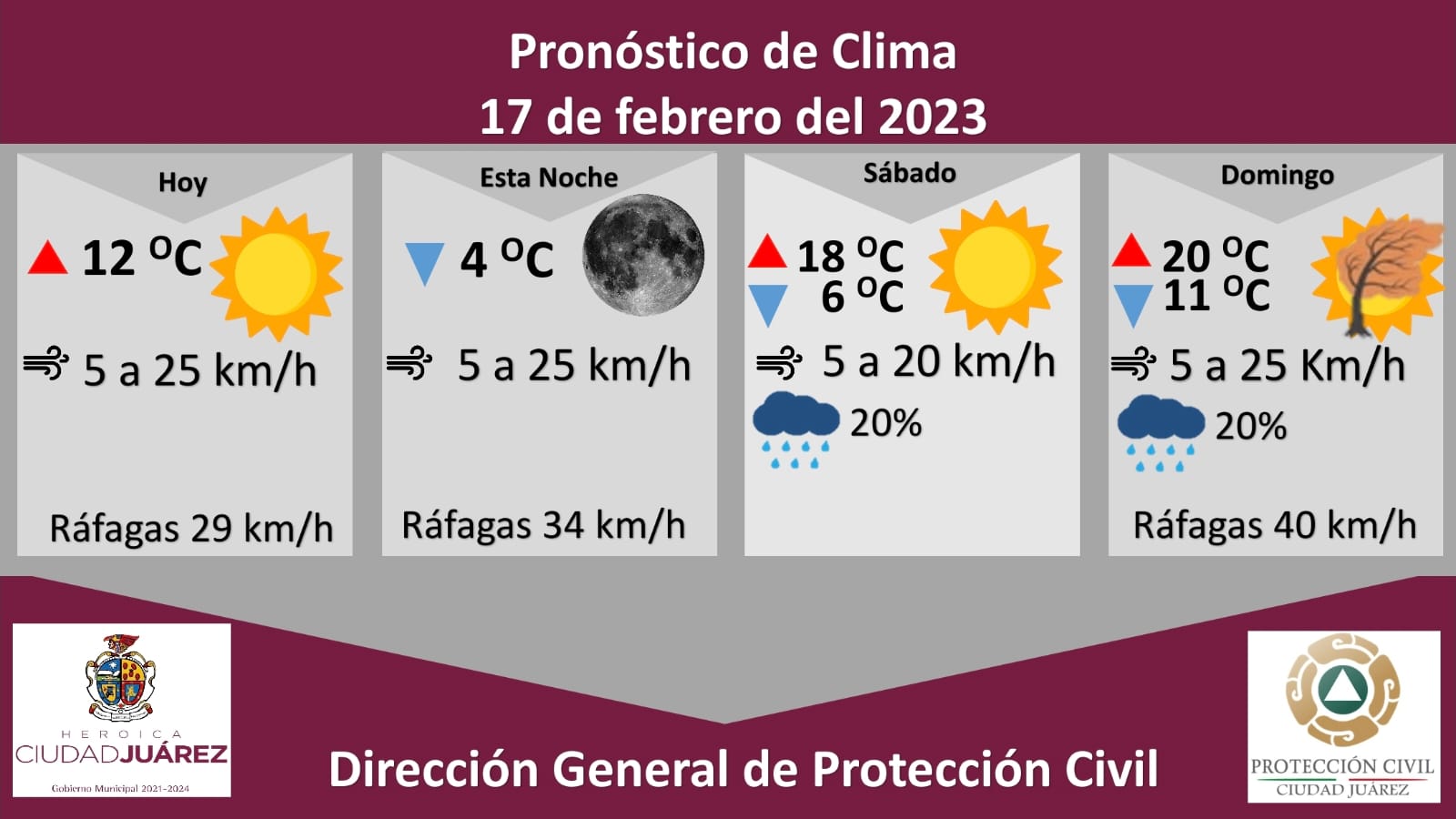 La Dirección General de Protección Civil, con base en informes del Servicio Meteorológico Nacional, pronostica un viernes soleado con una temperatura máxima de 12 grados Celsius, en tanto que la mínima será 4 °C por la noche, además se esperan fuertes ráfagas de viento que alcanzarán los 34 kilómetros por hora.