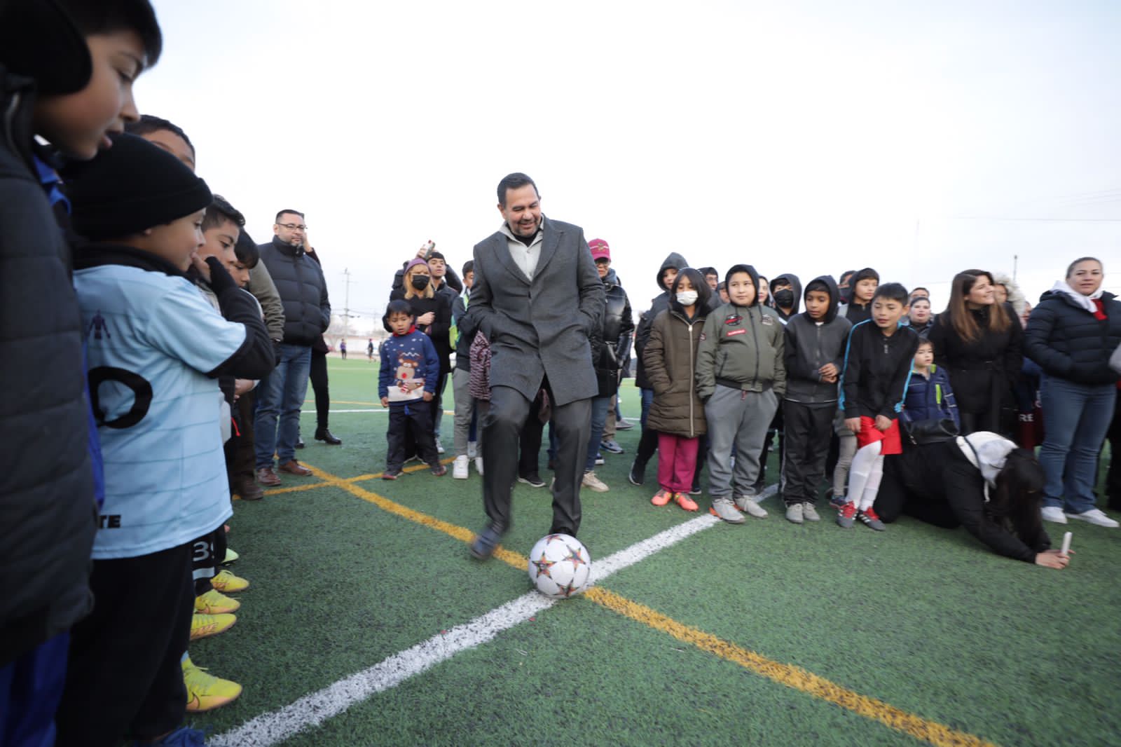 Con más de 2 mil 700 metros cuadrados de pasto sintético, malla ciclónica, alumbrado y adecuaciones para evitar inundaciones, fue entregada una cancha de fútbol a vecinos del Fraccionamiento Praderas de la Sierra.