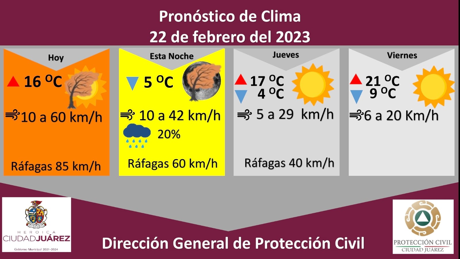 La Dirección General de Protección Civil, con base en informes del Servicio Meteorológico Nacional, emite una alerta naranja para este miércoles debido a que se esperan fuertes ráfagas de viento que alcanzarán los 85 kilómetros por hora, los cuales descenderán a 60 kilómetros por hora durante la tarde, además existe una probabilidad de lluvia de un 20 por ciento.