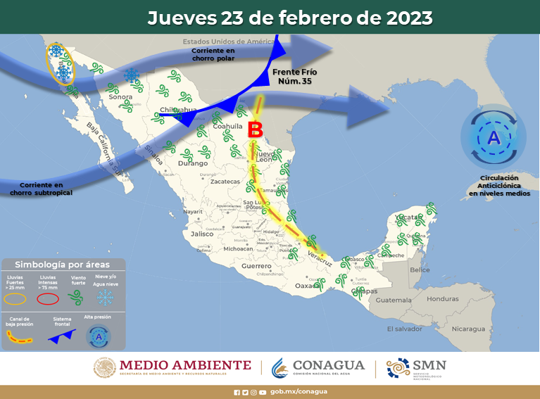 Para este jueves, el ingreso del frente frío número 35 a la entidad, en interacción con la corriente en chorro, traerán ambiente frío por la mañana, de templado a cálido por la tarde, temperaturas de gélidas a muy frías con heladas en la zona serrana, cielo de despejado parcialmente nublado, vientos de 10 a 25 km/h que pueden superar los 75 km/h en partes de las zonas noroeste y oeste, incluye Janos, Casas Grandes, Ignacio Zaragoza, Gómez Farías y Carichí.