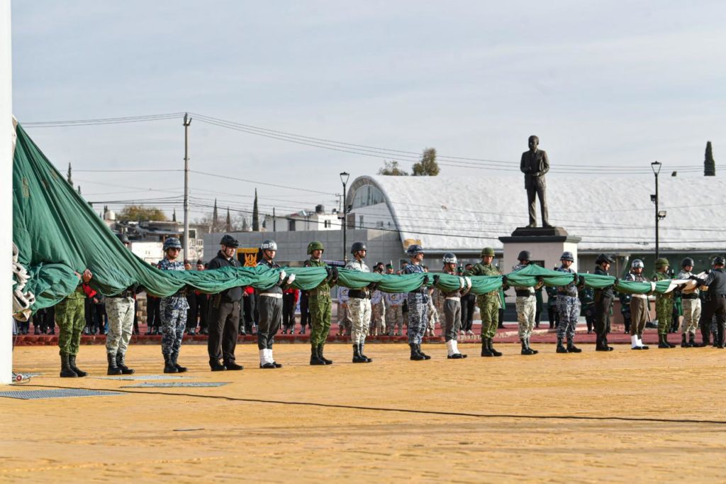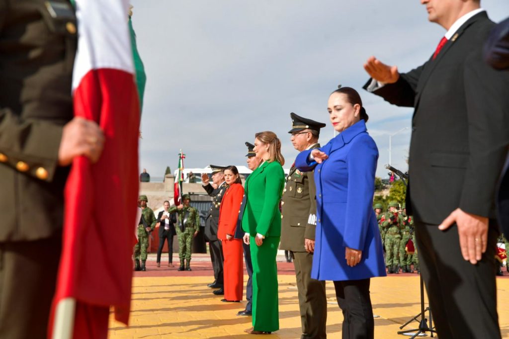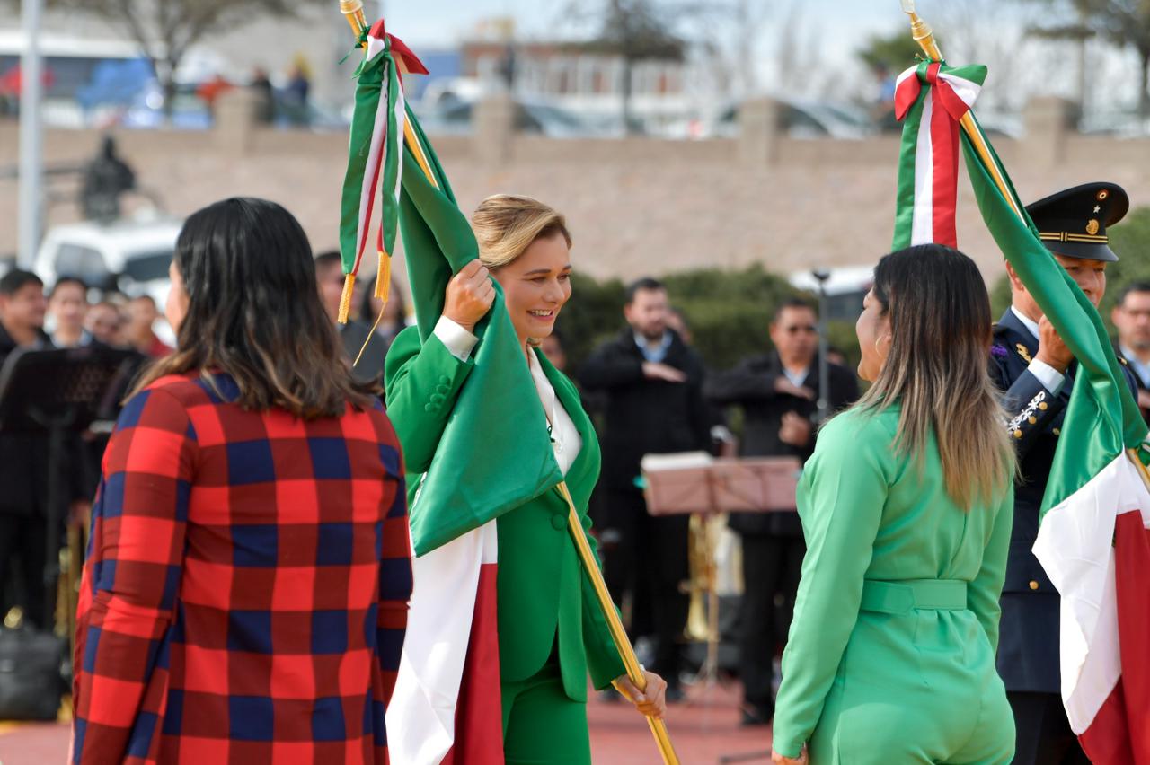 Acompañada por autoridades civiles y militares, la gobernadora Maru Campos encabezó el Izamiento del Lábaro Patrio, con motivo del Día de la Bandera, en ceremonia efectuada en la Plaza de El Palomar, donde expresó que la promesa de fidelidad que se realiza en esta fecha es también una promesa ante un futuro posible, y ante los más altos principios que permitan a los mexicanos y a los chihuahuenses vivir dignamente, con libertad y justicia.