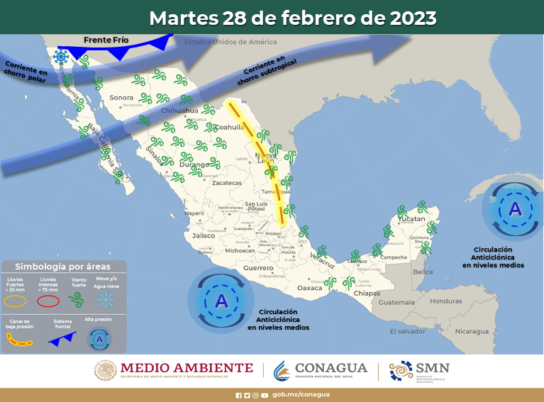 Para este martes, la masa de aire frío que impulsa al frente frío número 36 y la entrada de un nuevo frente frío (número 37) por el noroeste del país en interacción con una vaguada polar y las corrientes en chorro polar y subtropical, favorecerán ambiente de frío a fresco por la mañana, de cálido a caluroso por la tarde, temperaturas de gélidas a muy frías con heladas en la zona serrana, cielo de despejado a parcialmente nublado, vientos de 15 a 30 km/h, con rachas que pueden superar los 85 km/h en partes de las zonas noroeste, oeste y centro, incluye: Ignacio Zaragoza, Gómez Farías, Carichí, Nonoava, San Francisco de Borja y Majalca.