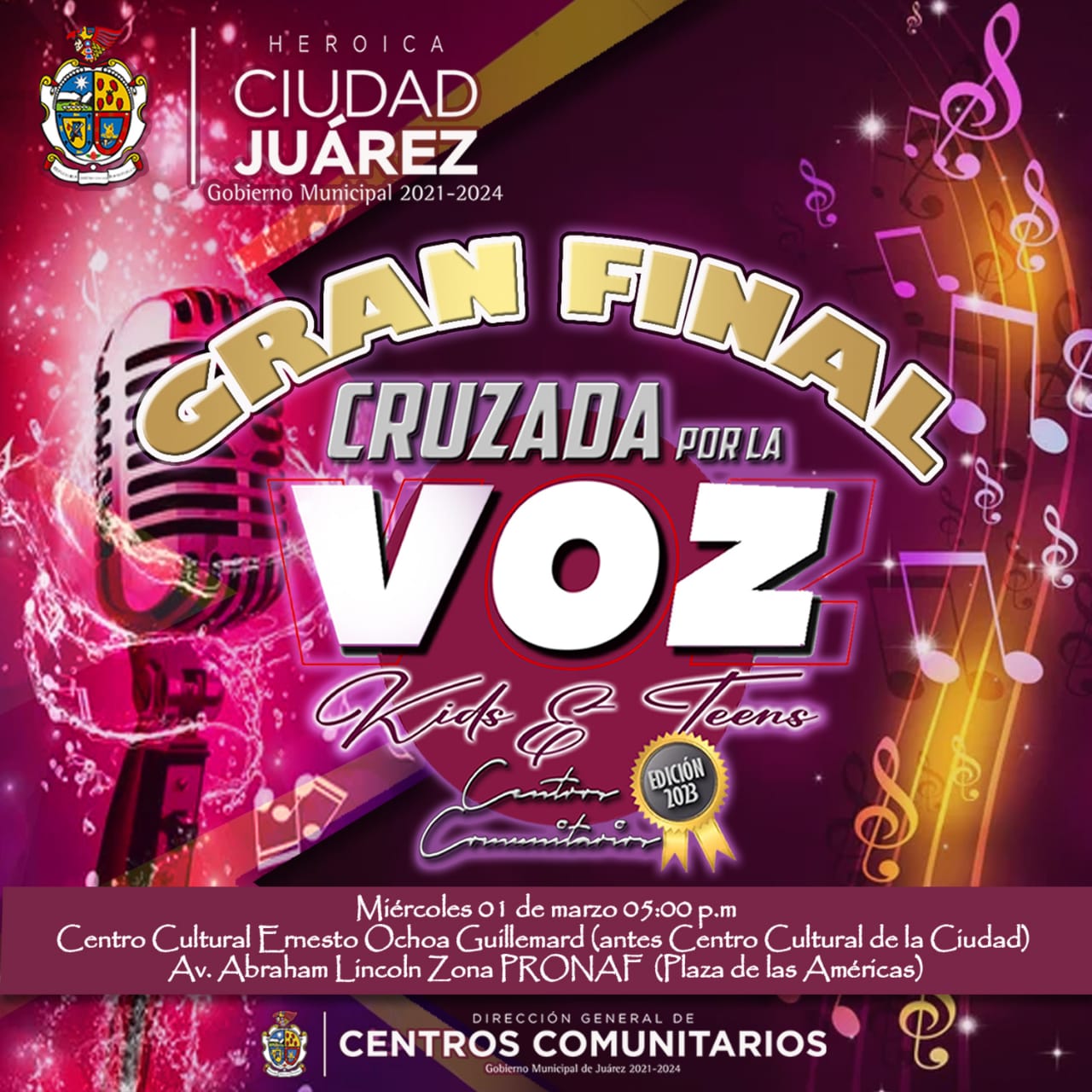 La Dirección General de Centros Comunitarios invita a la Gran Final de la Cruzada por la Voz Kids & Teens, que se llevará a cabo hoy a las 17:00 horas.