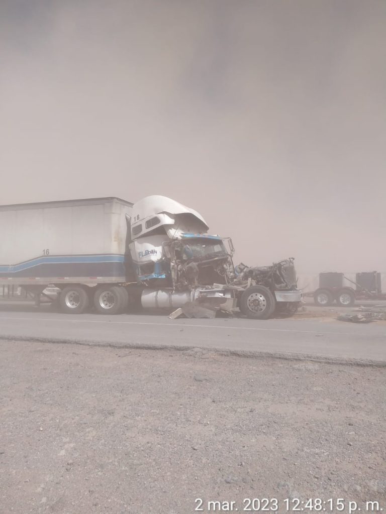 Asimismo, sobre la carretera Chihuahua-Delicias, en el kilómetro 172+000, se suscitó un accidente vehicular generado por la baja visibilidad, donde se vieron involucrados dos tráiler; además en el km 100 de la vía corta a Parral- Chihuahua, un tracto camión de carga pesada volcó, debido las fuertes ráfagas de viento.