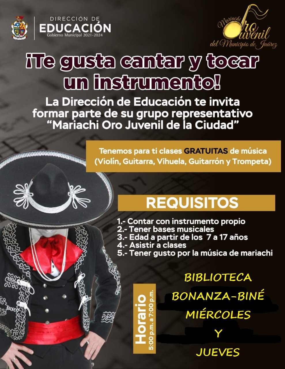 En ese mismo espacio se llevan a cabo las clases de música para formar parte del Mariachi Oro Juvenil de la Ciudad. El taller se imparte los días miércoles y jueves de 5:00 a 7:00 de la tarde y está dirigido a edades de 7 a 17 años.
