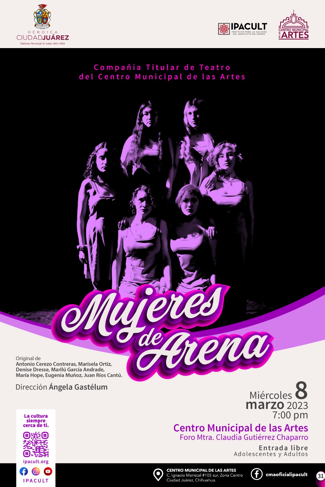 El próximo miércoles 8 de marzo a las 7:00 de la tarde se presenta en el foro “Claudia Chaparro” del Centro Municipal de las Artes (CMA), la obra Mujeres de Arena, original de Antonio Cerezo, Marisela Ortiz, Denise Dresse, Marilú García, María Hope, Eugenia Muñoz y Juan Ríos Cantú, bajo la dirección de Ángela Gastélum.