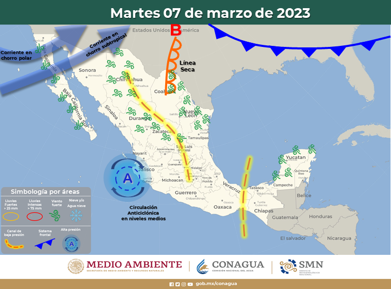 Este martes, incidirán sobre el territorio estatal la corriente en chorro subtropical y una línea seca. Se prevé la presencia de nubosidad variable, con posibles lluvias que pueden estar acompañadas de actividad eléctrica sobre municipios de las regiones Casas Grandes y Frontera-Juárez, principalmente; estas pueden estar acompañadas de actividad eléctrica y potencial presencia de granizo. Ambiente muy frío a frío durante la mañana y noche, cálido a caluroso por la tarde. Se esperan vientos con rachas que pueden oscilar entre 50 y 60 km/h en municipios de las regiones Cuauhtémoc-Madera y Sierra Tarahumara.