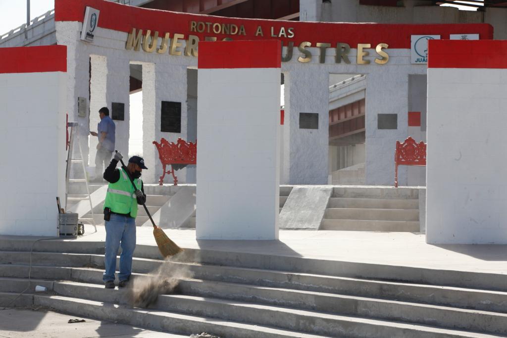 Brigadas de la Dirección de Limpia trabajan en la limpieza de la Rotonda a las Mujeres Ilustres ubicada en el crucero de la avenida Sanders y Eje Vial Juan Gabriel.