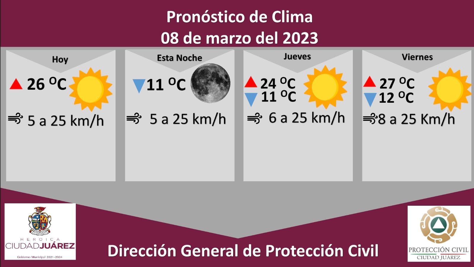 Para mañana jueves se pronostica un día soleado, la temperatura máxima será de 24 °C, con una mínima de 11, la velocidad del viento oscilará de 6 a 25 kilómetros por hora.