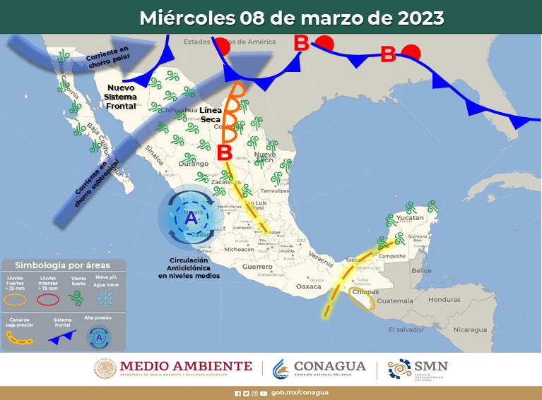 Para este miércoles, el ingreso del frente frío número 40 en el extremo noroeste del país, en interacción con la corriente en chorro y un canal de baja presión, favorecerán ambiente fresco por la mañana, de cálido a caluroso por la tarde, temperaturas de muy frías a frías con heladas en la zona serrana, cielo de mayormente despejado a parcialmente nublado, vientos de 5 a 20 km/h, con rachas que pueden superar los 75 km/h en partes de la zona noroeste, incluye: Janos y Casas Grandes.