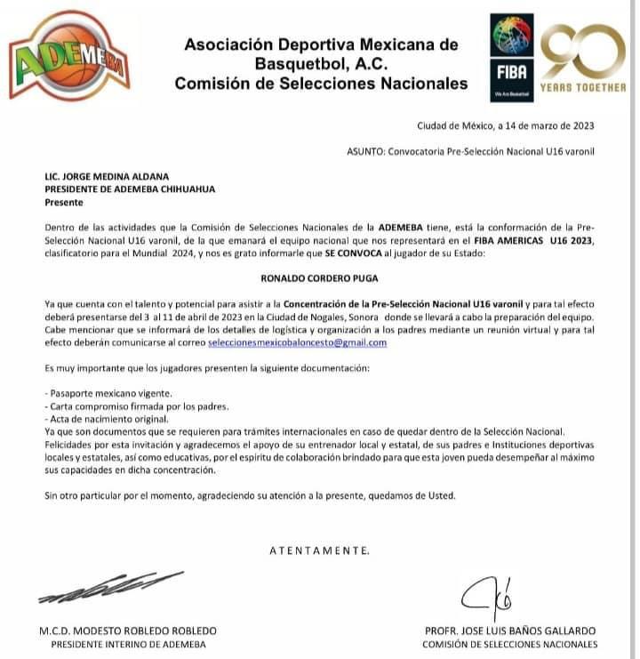El juarense Ronaldo Cordero Puga fue convocado por la Federación Mexicana de Básquetbol para integrarse a la selección nacional y representar a México en eventos internacionales de básquetbol FIBA, de la categoría U-16.