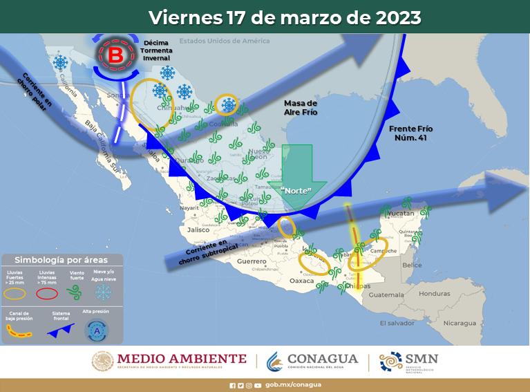 La Coordinación Estatal de Protección Civil (CEPC) informa que debido al ingreso de la Décima Tormenta Invernal y una corriente en chorro polar, se prevé la posibilidad de precipitaciones en forma de lluvias, nieve y aguanieve, además de vientos y un descenso marcado de temperaturas en gran parte del estado.