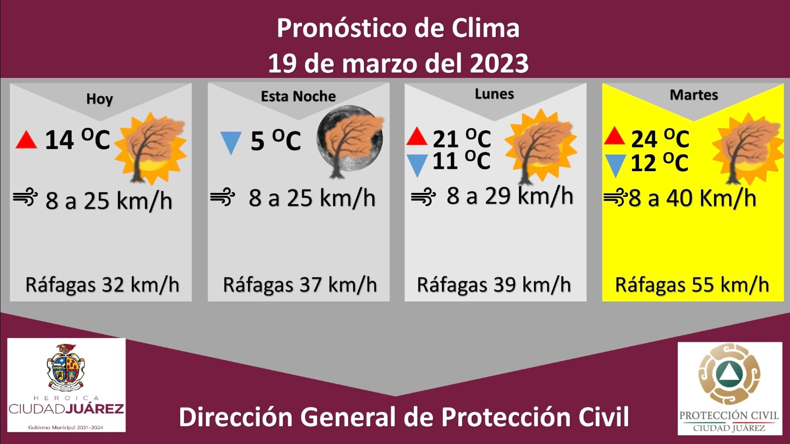 El martes se emitirá una alerta amarilla debido a fuertes ráfagas de viento que alcanzarán los 55 kilómetros por hora, la temperatura máxima será de 24 °C y mínima de 12 °C, la velocidad del viento será de 8 a 40 kilómetros por hora.