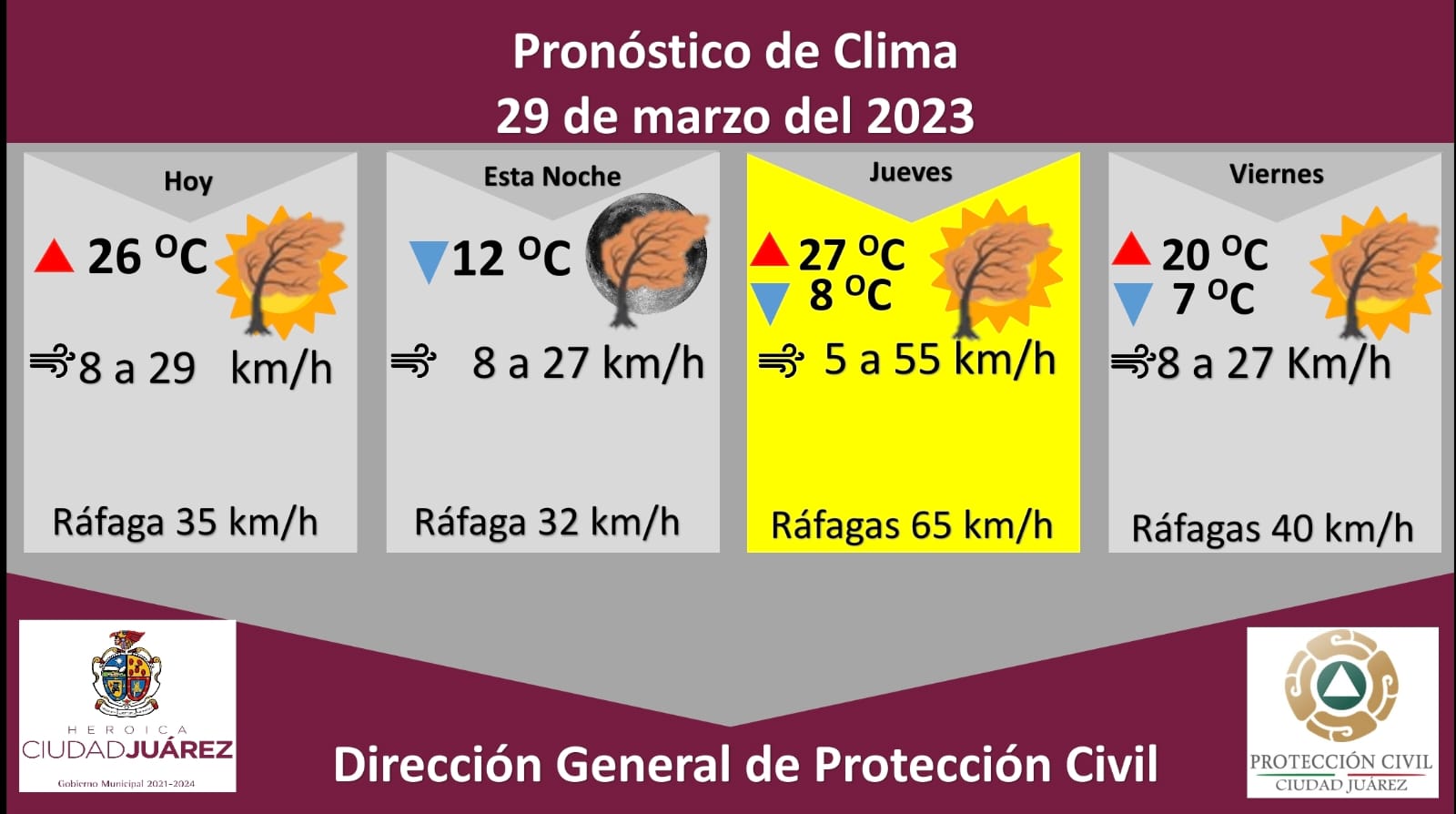 La Dirección General de Protección Civil, con base en informes del Servicio Meteorológico Nacional, pronostica ráfagas de viento de hasta 35 kilómetros por hora, los cuales descenderán por la tarde a 32 kilómetros por hora, informó Roberto Briones Mota, titular de la dependencia.