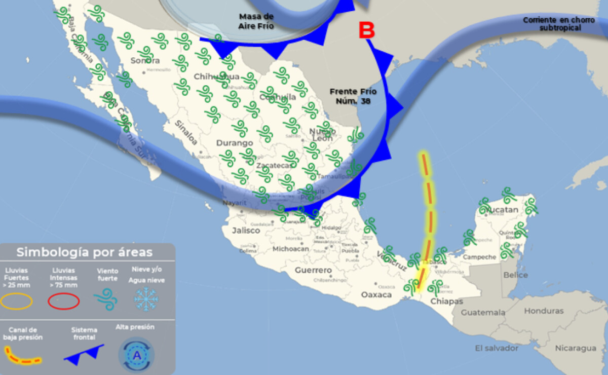 La masa de aire asociada al frente modificará sus características térmicas propiciando un aumento de las temperaturas en el noreste y oriente del territorio mexicano. Canal de baja presión sobre el centro del país, propiciará chubascos y lluvias puntuales fuertes con descargas eléctricas y posible caída de granizo en la región mencionada.