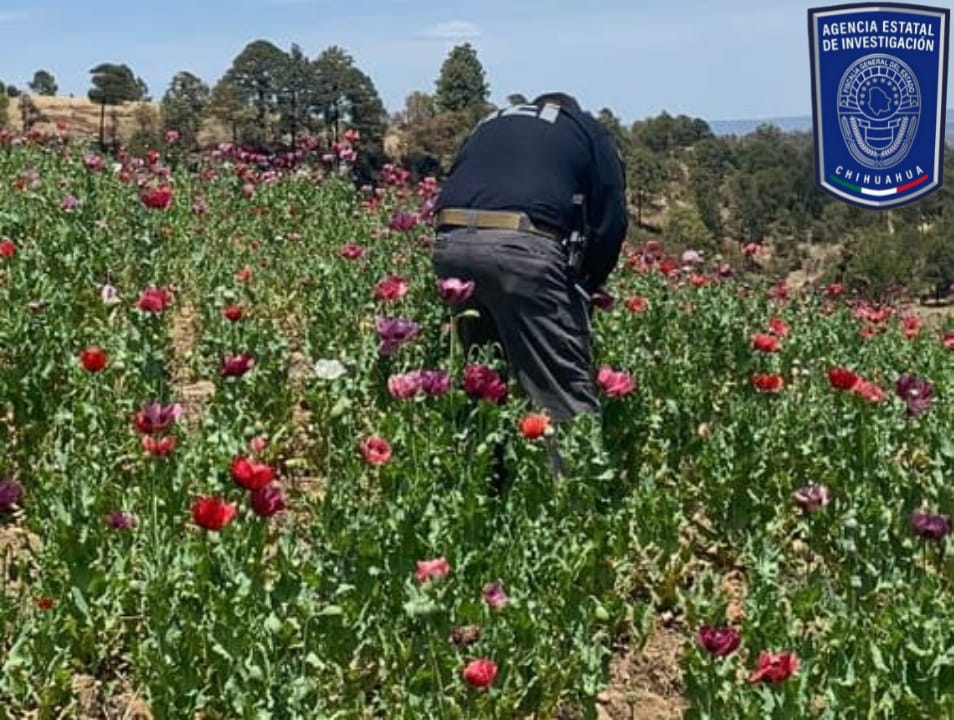 Elementos de la Agencia Estatal de Investigación, del Destacamento de Guadalupe y Calvo, destruyeron un plantío de amapola en un predio de Baborigame.