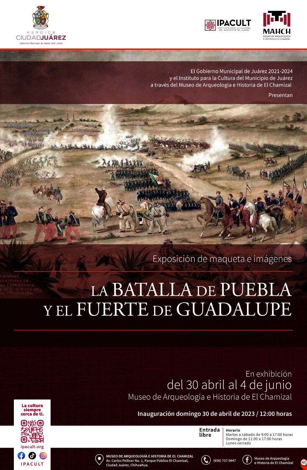 El próximo sábado 30 de abril a las 12:00 del mediodía, será la inauguración de la exposición La Batalla de Puebla y el Fuerte de Guadalupe, en el Museo de Arqueología e Historia de El Chamizal (MAHCH), con dirección en la calle Carlos Pellicer número 1 del parque El Chamizal.