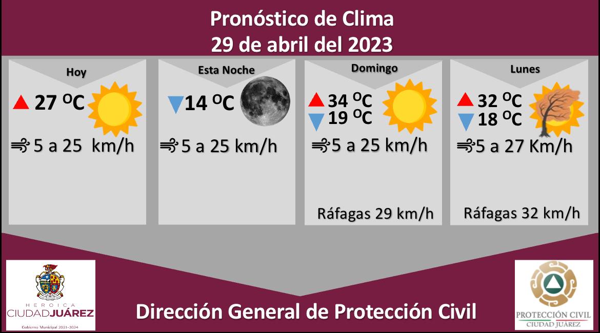 Para mañana domingo se esperan fuertes ráfagas de viento las cuales alcanzarán los 29 kilómetros por hora, la temperatura máxima será de 34 °C, en tanto que la mínima será de 19 °C, la velocidad del viento se pronostica entre 5 y 25 kilómetros por hora.