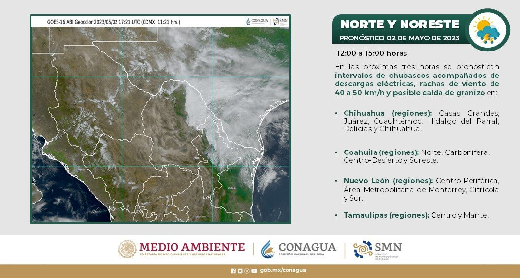 También, se pronostica la presencia de lluvias en Madera, Temósachic, Moris, Ahumada, Ascensión, Casas Grandes, Chínipas, Ocampo y Bocoyna. Las lluvias pueden estar acompañadas de caída de granizo y actividad eléctrica.