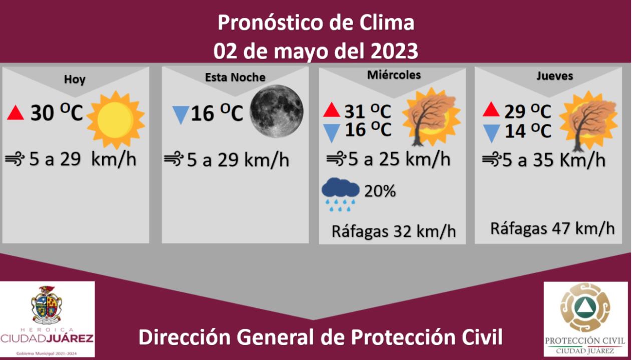 Para mañana miércoles existe una probabilidad de lluvia de un 20 por ciento, además se esperan ráfagas de viento de hasta 32 kilómetros por hora, la temperatura máxima será de 31 °C y mínima de 16 °C, el viento oscilará de 5 a 25 kilómetros por hora.