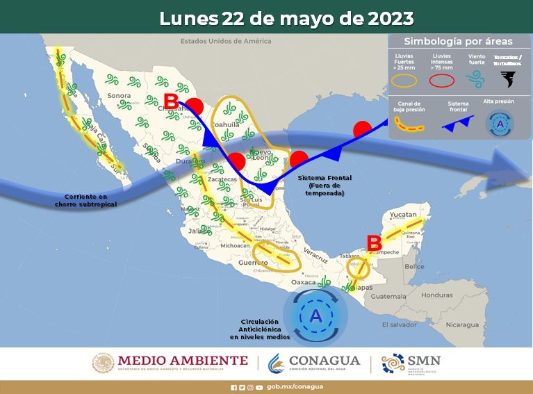 Para este lunes 22 de mayo, el nuevo frente frío se ubicará sobre el noreste del país, en interacción con la corriente en chorro, un canal de baja presión y la entrada de humedad procedente del Océano Pacífico, que favorecerá la presencia de rachas de vientos que pueden superar los 70 kilómetros por hora (km/h) particularmente en Ascensión, Janos, Nuevo Casas Grandes, Buenaventura, Namiquipa, Guerrero, Carichí, Nonoava, Balleza, Cuauhtémoc, San Francisco de Borja, Chihuahua, Camargo y Coyame.