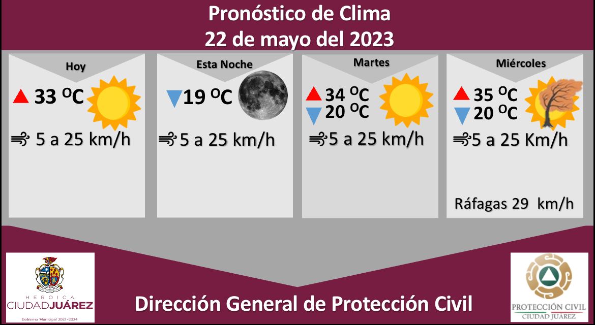 Para mañana martes se espera una temperatura máxima de 34 °C y mínima de 20 °C, la velocidad del viento se pronostica de 5 a 25 kilómetros por hora.
