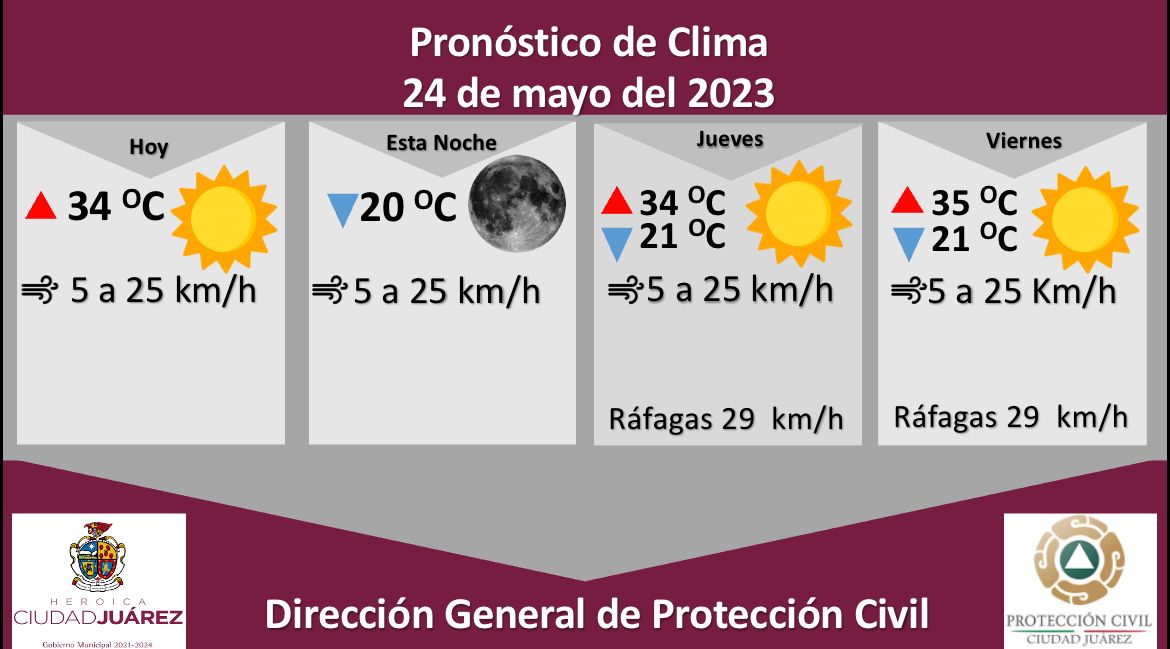 Para mañana jueves se esperan fuertes ráfagas de viento que alcanzarán los 29 kilómetros por hora con una temperatura máxima de 34 °C y mínima de 21 °C, la velocidad del viento se pronostica de 5 a 25 kilómetros por hora.