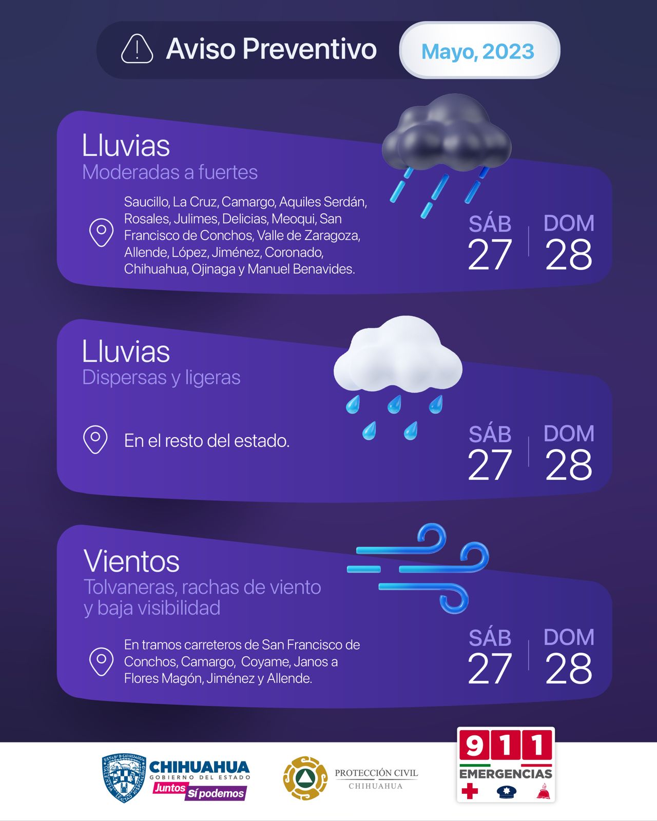 Asimismo, refiere que en los municipios de Chihuahua, Aquiles Serdán, Aldama, Julimes, Rosales, Delicias, Meoqui, Saucillo, San Francisco de Conchos, Valle de Zaragoza, Allende, Parral, Santa Bárbara, López, Jiménez, Coronado, Coyame y Ojinaga, las lluvias podrán ser fuertes a moderadas, con intervalos de chubascos.
