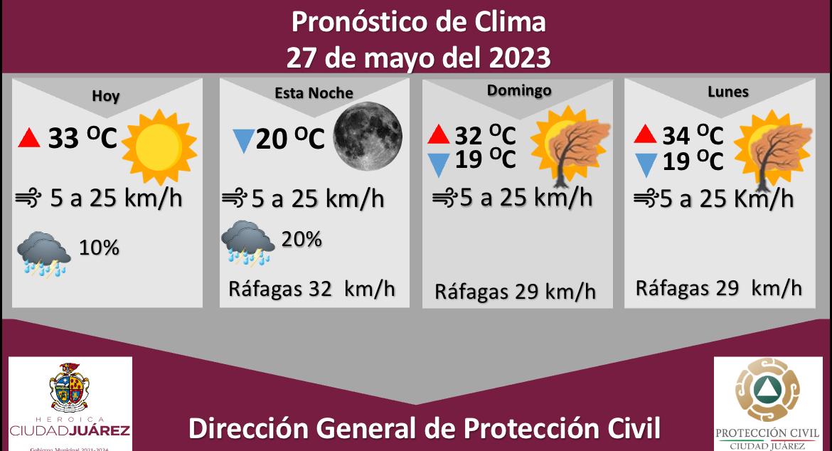 Para mañana domingo se esperan fuertes ráfagas de viento que alcanzarán los 29 kilómetros por hora, la temperatura máxima será de 32 °C y mínima de 19 °C, la velocidad del viento se pronostica de 5 a 25 kilómetros por hora.