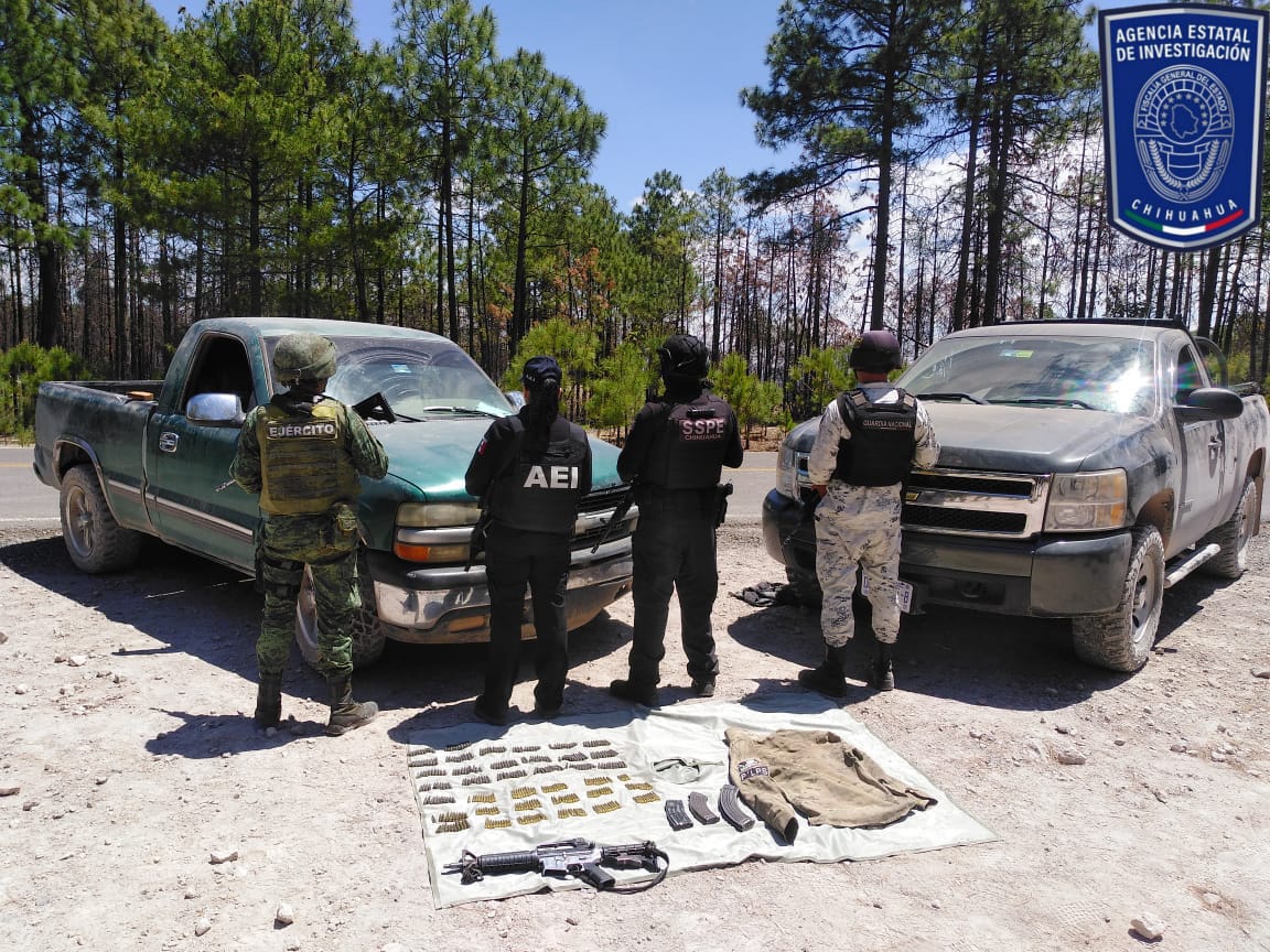 La intervención se registró este domingo 28 de mayo, cuando personal de la Agencia Estatal de Investigación (AEI), de la Secretaría de Seguridad Pública Estatal (SSPE), Ejercito Mexicano y Guardia Nacional, realizaban trabajos de seguridad sobre la carretera Guachochi- Yoquivo.