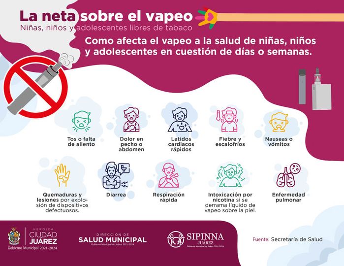 Además, señaló que el cigarrillo electrónico afecta en la salud de los niños y adolescentes, pues estos pueden presentar síntomas como tos o falta de aliento, dolor en el pecho o abdomen, latidos cardiacos rápidos, fiebre o escalofríos, nauseas o vómito, quemaduras y lesiones por exposición a dispositivos defectuosos, diarrea, respiración rápida, intoxicación por nicotina si se derrama líquido de vapeo sobre la piel, así como enfermedad pulmonar.