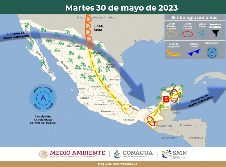 Para este martes, una línea seca sobre los límites entre Chihuahua y Coahuila en interacción con un canal de baja presión, divergencia en altura y la entrada de humedad del Océano Pacífico y Golfo de México, favorecerán ambiente de fresco a templado por la mañana, de caluroso a muy caluroso por la tarde, temperaturas frías en la zona serrana, cielo de despejado a mayormente despejado, vientos de 5 a 20 km/h, con rachas que pueden superar los 55 km/h en partes de la zona noroeste, incluye: Ascensión y Janos.