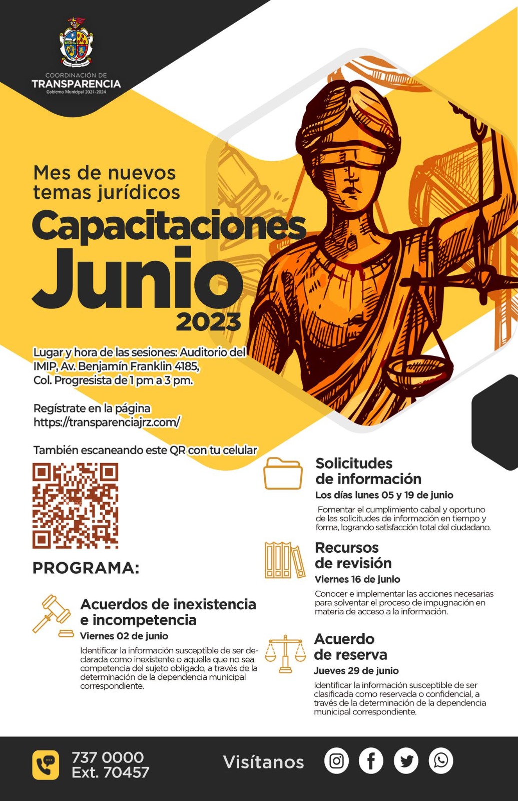 El 16 de junio se llevará a cabo el taller “Recursos de revisión”, a fin de conocer e implementar las acciones necesarias para solventar el proceso de impugnación en materia de acceso a la información, mientras que el día 29 del mismo mes se impartirá el tema “Acuerdos de reserva”.