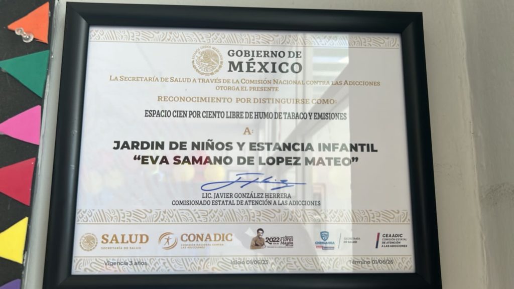 Derivado del trabajo que se hizo desde el mes de febrero con un programa intenso de concientización y modificando algunas medidas, el Jardín de Niños y Estancia Infantil Eva Sámano de López Mateos logró obtener su acreditación de espacio 100 por ciento libre de humo de tabaco y emisiones.Yossi Yazmín Narváez González, directora de la estancia, señaló que fueron alrededor de tres meses de trabajo con los Centros de Atención Primaria en Adicciones, con capacitaciones de concientización a todo el personal sobre las enfermedades y riesgos del tabaco y otras acciones, para lograr la certificación.
