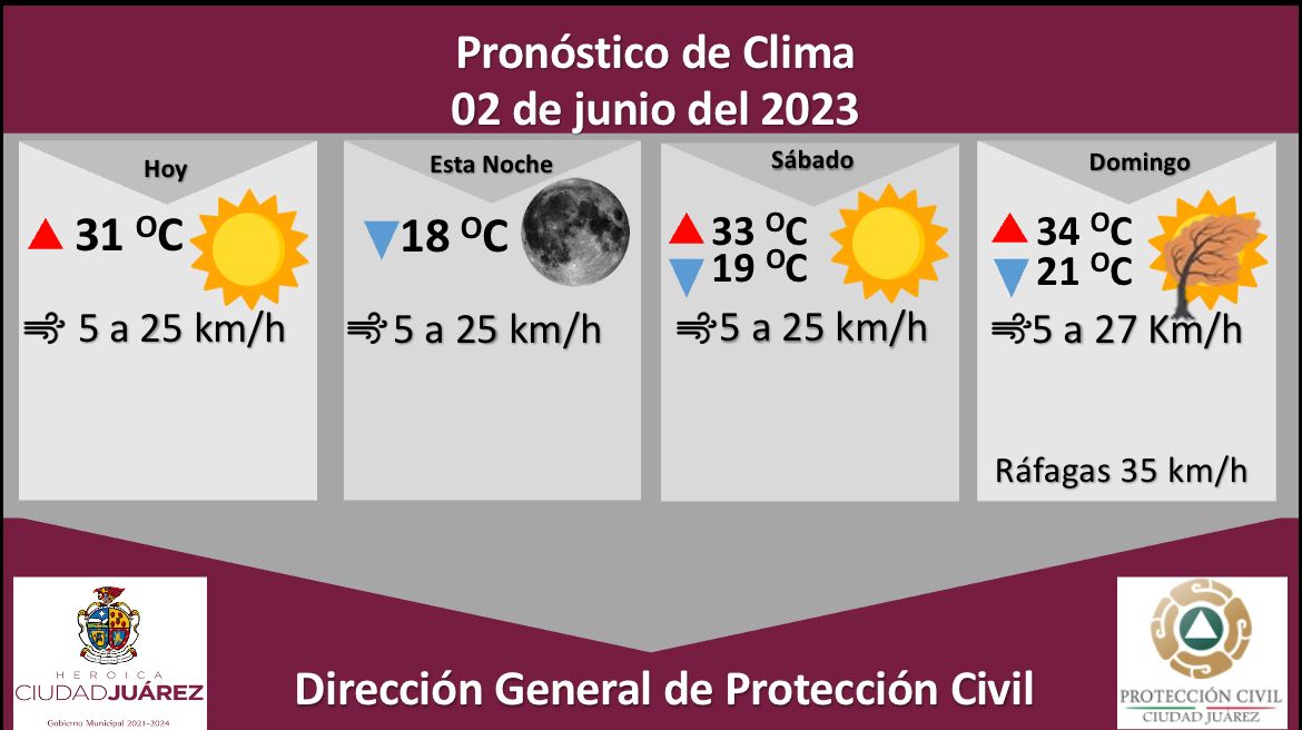 Para mañana sábado se espera una temperatura máxima será de 33 °C y mínima de 19 °C, la velocidad del viento se pronostica de 5 a 25 kilómetros por hora.El domingo será un día soleado, la temperatura máxima será de 34 °C y mínima de 21 °C, la velocidad del viento se pronostica de 5 a 27 kilómetros por hora.