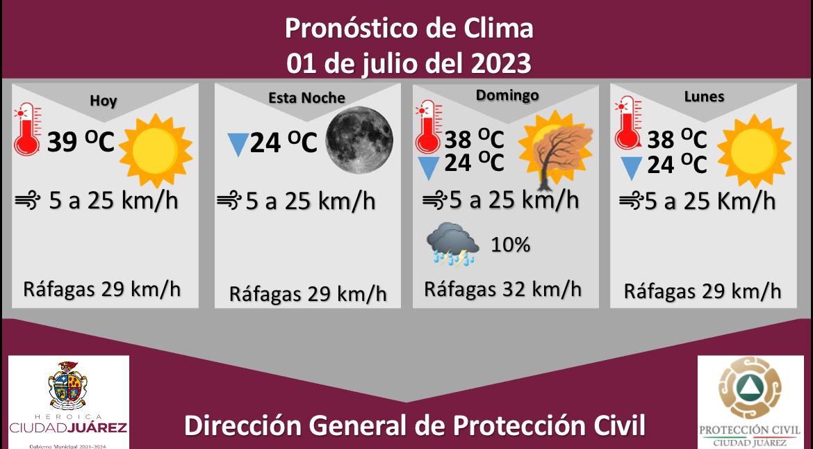 Para mañana domingo se esperan ráfagas de viento que alcanzarán los 32 kilómetros por hora, además existe un 10 por ciento de probabilidad de lluvia, la temperatura máxima será de 38 °C, mientras que la mínima se pronostica en 24 °C, la velocidad del viento oscilará de 5 a 25 kilómetros por hora.