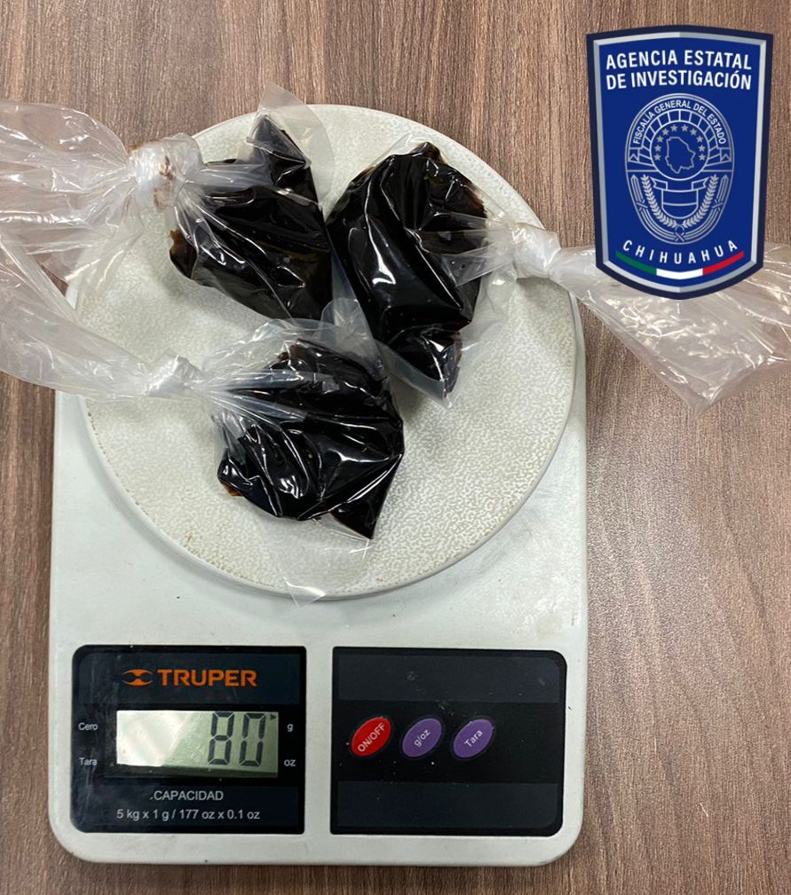 • Tres bolsas transparentes que en su interior contienen una sustancia pastosa de color negro con las características propias de la heroína, dando un peso de 80 gramos.