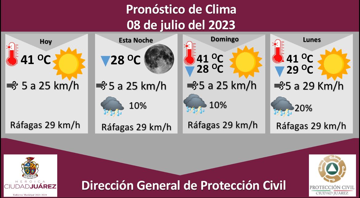 La Dirección General de Protección Civil, con base en informes del Servicio Meteorológico Nacional, pronostica un sábado soleado con una temperatura máxima de 41 grados Celsius, mientras que la mínima será de 28 °C por la noche, además existe una probabilidad de lluvia de un 10 por ciento.