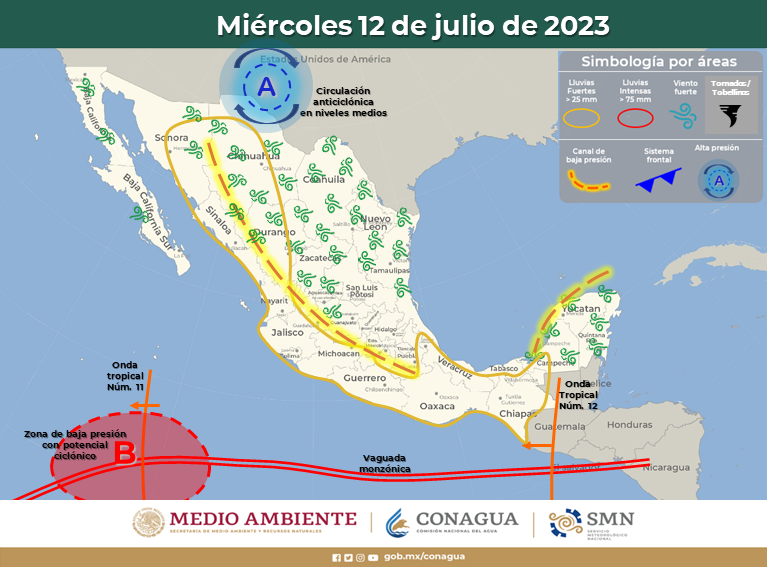 Un canal de baja presión se mantiene presente sobre el territorio estatal, e interactuando con el aporte húmedo oceánico, originará la presencia de nubosidad variable, así como lluvias fuertes a muy fuertes en algunos municipios de las regiones Cuauhtémoc-Madera y Sierra Tarahumara; de menor intensidad en municipios de otras en donde también se prevén lluvias.