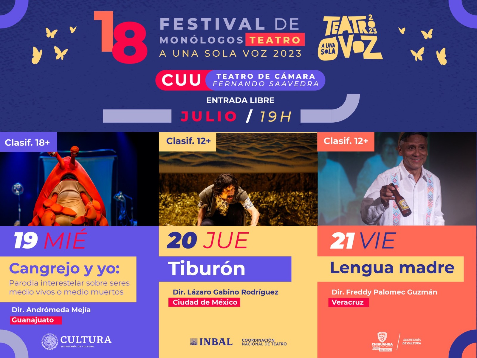 La Secretaría de Cultura de Chihuahua invita a la 18va edición del Festival de Monólogos – Teatro A Una Sola Voz, que desarrollará en coordinación con la Secretaría de Cultura del Gobierno de México y el Instituto Nacional de Bellas Artes y Literatura (Inbal).