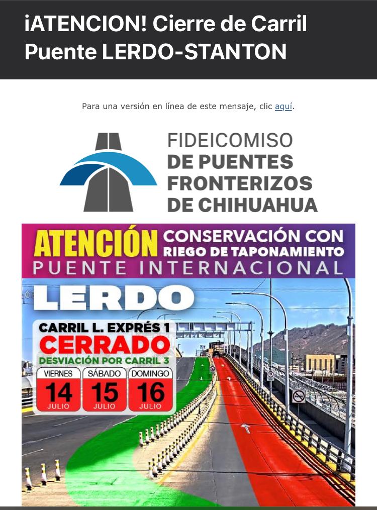Dentro de los trabajos de mantenimiento de puentes internacionales, el Fideicomiso de Puentes Fronterizos de Chihuahua (FPFCH), a través del Área de Proyectos, informó que los días 14, 15 y 16 de julio estará cerrado el carril 1 de la Línea Exprés del Puedo Lerdo-Stanton, para reabrirse a la circulación el próximo lunes 17 de julio.