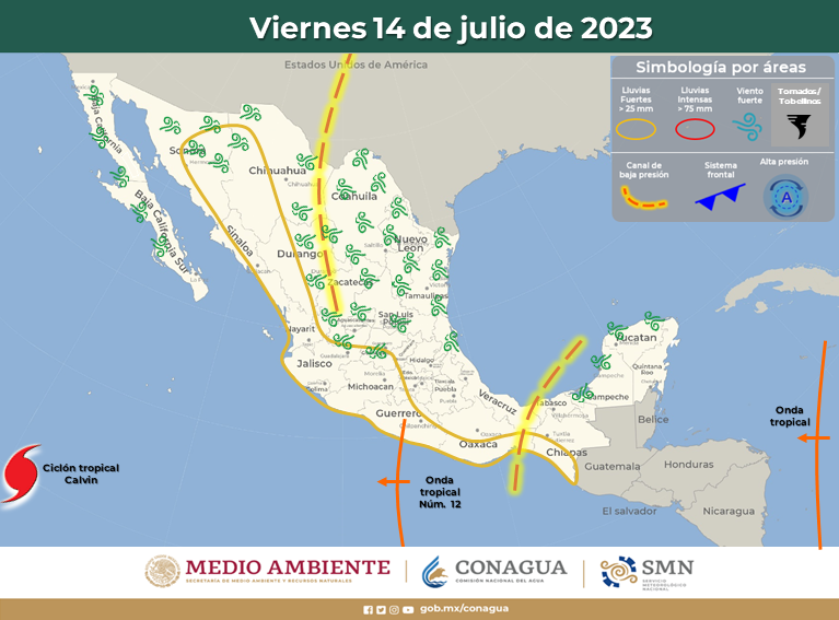 El monzón mexicano continuará establecido sobre el noroeste del país, originando lluvias fuertes a puntuales muy fuertes acompañadas de descargas eléctricas, fuertes rachas de viento y posibles granizadas sobre los estados de Sonora, Sinaloa, la región serrana de Chihuahua y Durango.