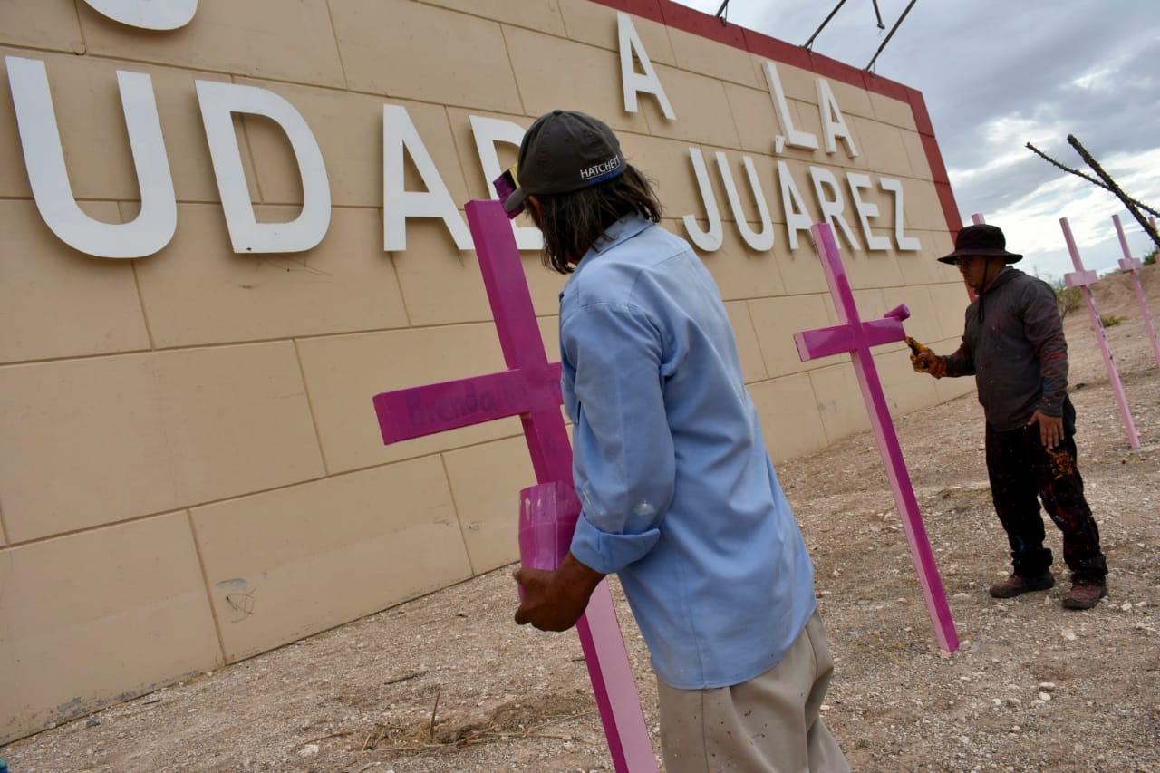 Una cuadrilla de la Dirección de Parques y Jardines trabaja en pintar las cruces rosas ubicadas en el espacio donde se encuentra el monumento Umbral del Milenio, al sur de la ciudad, por la carretera Panamericana.