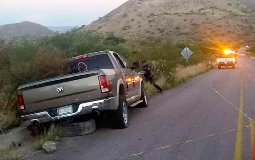 El reporte se recibió aproximadamente a las 05:20 horas del sábado, localizando una pick up Ram con matrícula de circulación del estado de Chihuahua, la cual presentaba daños en la parte frontal izquierda por choque y varios impactos en su carrocería por proyectil de arma de fuego.