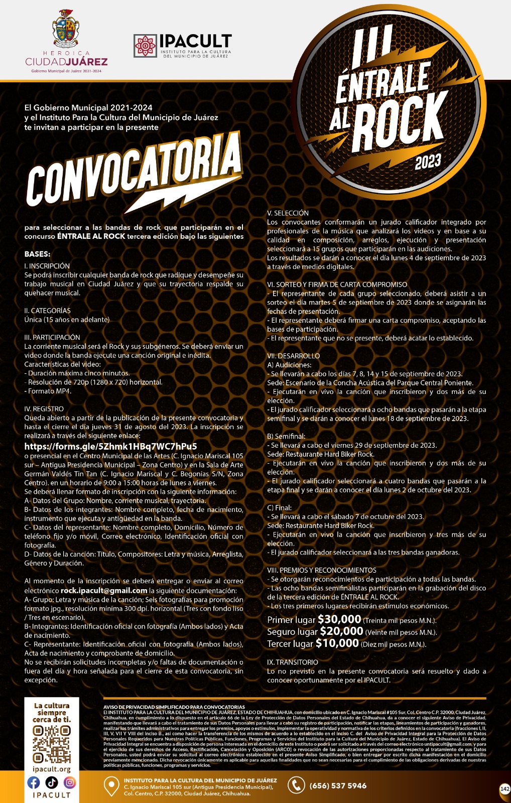 El Instituto para la Cultura del Municipio de Juárez (IPACULT) abre la convocatoria para el próximo concurso “Éntrale al Rock”, que se llevará a cabo en tres etapas, dio a conocer su titular Miguel Ángel Mendoza Rangel, en conferencia de prensa.