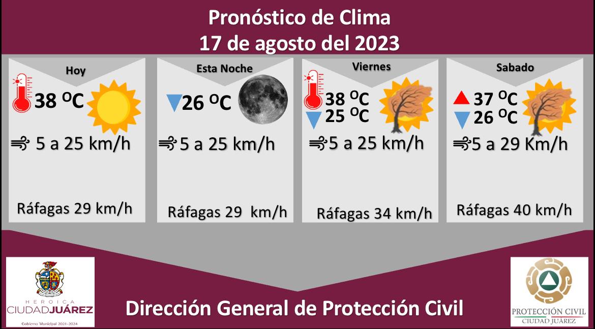 La Dirección General de Protección Civil, con base en informes del Servicio Meteorológico Nacional, pronostica una temperatura máxima de 38 °C para este jueves, mientras que la mínima para esta noche será de 26 °C, además se esperan ráfagas de viento de hasta 29 kilómetros por hora.